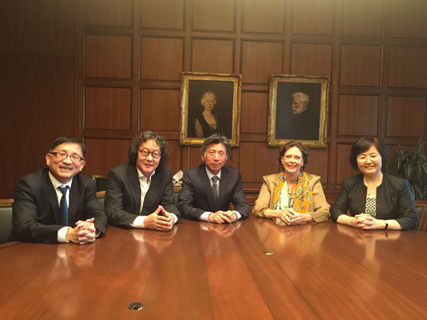 (左起)约翰·桑顿中国中心主任李成、徐冰、范迪安、史密森博物馆中国艺术部主任司美茵、中国驻美国大使馆公使衔参赞李鸿