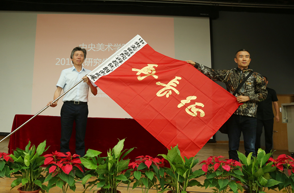 8月31日上午,范迪安院长首先为2016级硕、博士研究生带来开学第一课。作为一项特殊环节,院长为新学期伊始投入“再长征”创作活动的造型学院基础部团队,授予了他亲笔题写的“再长征”创作团队旗帜。造型学院副院长、基础部主任张路江代表创作团队接旗,率领基础部4名教师和20名研究生,一同奔赴四川阿坝藏区羌族自治州若尔盖县开展实地写生创作。