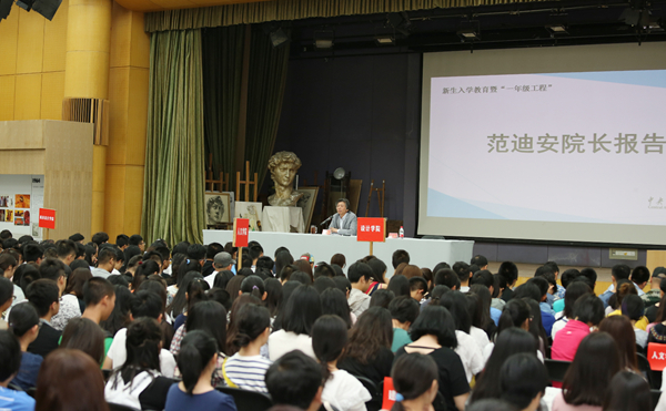 范迪安院长结合中国美术教育的百年进程、当今世界发展趋势,旁征博引,与800多名新入学的本科生交流读书学习方法,希望本科生同学读好“三本书”:传统之书、专业之书和社会之书,并从艺术学习的规律给大家提出必要的学习方法。