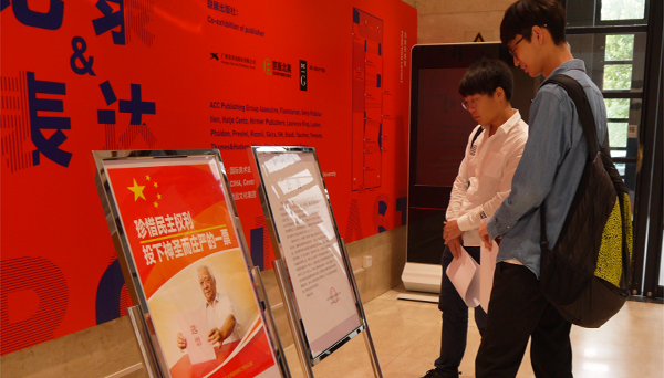 学生观看设计学院陈列海报及选民登记公告