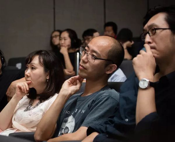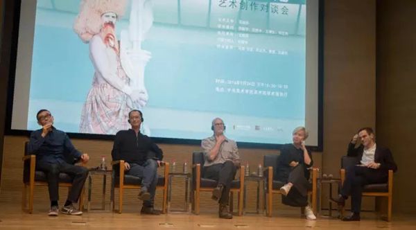 9月24日下午,艺术家马修·巴尼来到刚刚放映结束的美术馆报告厅,与苏新平副院长、吕胜中教授、邱志杰教授,尤伦斯当代艺术中心馆长田霏宇,艺术家汪建伟、曹斐,以及现场观众进行创作座谈。苏新平副院长在座谈致辞中谈到,影片的气质在具有艾略特的《荒原》的恢弘之外,还给人以各种措手不及的感觉。此次活动的发起人吕胜中教授认为马修·巴尼的表达是对事物背后实质的一种犀利观察,正如中国的《山海经》,实际上是一种异化了的对事实的陈述。邱志杰教授认为马修·巴尼在影片中呈现的是我们习惯认知之外的另一个美国,是被19世纪末的宗教运动渗透过的,深受非洲异教精神影响的,与以安迪·沃霍尔为代表的波普艺术不同的美国。参与座谈的嘉宾分别从不同方面解读了《重生之河》的艺术手法及其个人创作思想的特点。现场观众与马修·巴尼展开了热烈的交流讨论。