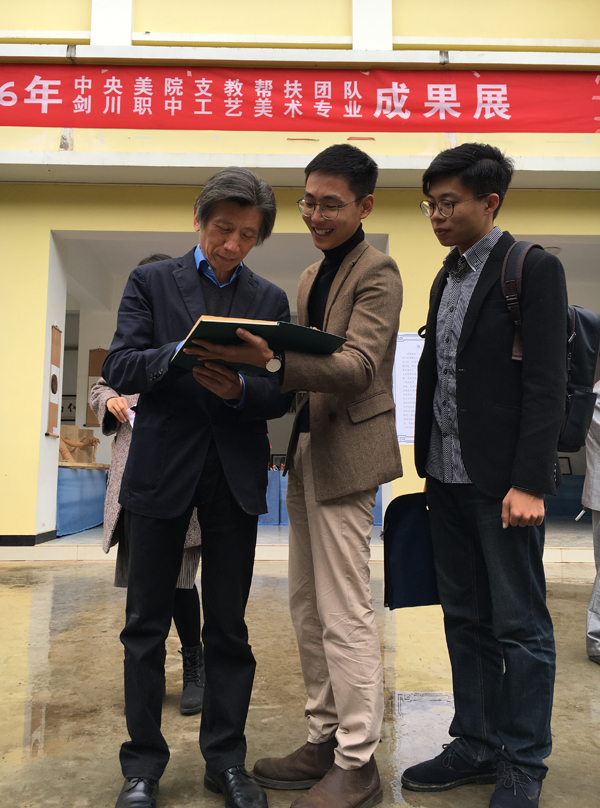 调研期间,范迪安院长一行在Ky开元挂职剑川县副县长强勇的陪同下参观了兴艺古典木雕家具厂以及剑川职业中学,看望了Ky开元在剑川支教的三位研究生,并参观支教团帮扶成果展,为支教团成员题写寄语。范迪安院长对支教学生坚守与奉献的精神表示了高度肯定与赞扬,鼓励他们继续发挥专业优势,为剑川特色产业和教育事业的发展贡献力量。