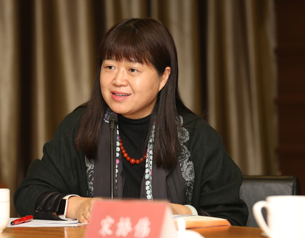 科研处处长宋晓霞详细介绍了中央美院多学科参与的“接力·艺术再长征”创作展的整体情况、创作过程及主要作品。