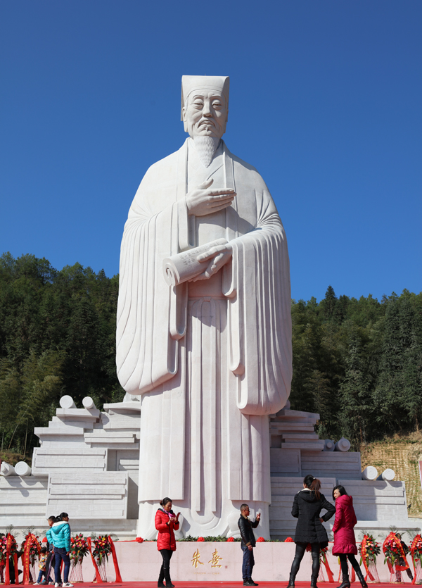 此座朱子雕像高23.66米,约71尺,象征朱子71年的生命历程,朱熹雕像的落成成为武夷山朱子故里的新地标。雕像背靠文公山,面向籍溪水,周边莲荷环绕。朱子面容慈祥,左手持卷,右手捧心,好似正与访客娓娓道来其正心诚意、格物致知之学。雕像以世界朱氏联合会提供的三幅朱子画像为蓝本,采用中国传统造像手法,深入研究朱熹精神品质创作而成。静穆的站立造像,强调内涵、静态,表现大思想家、大儒家的气势和气度,糅合了对传统文化和当代审美的思考。