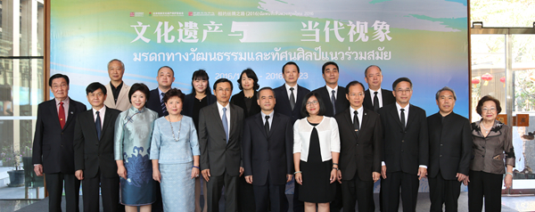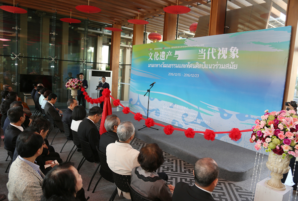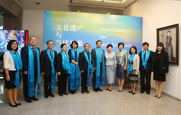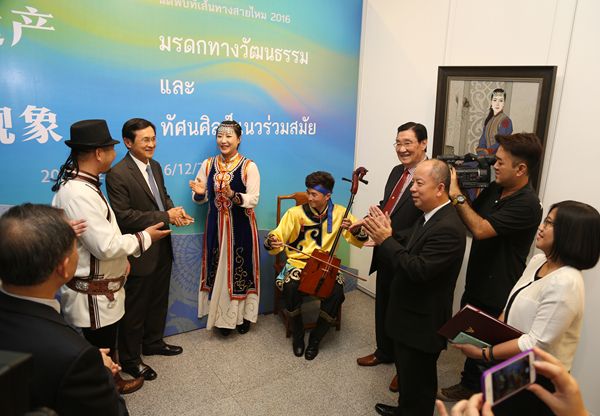 为了深入贯彻落实中央“一带一路”战略,从丝绸之路沿线区域文明中吸纳不同艺术的滋养,促进“一带一路”各国文化之间的交融,2016年12月17日下午三时,“相约丝绸之路2016——文化遗产与当代视象”展览在曼谷中国文化中心开幕。泰国前副总理扎都隆·猜盛,中国驻泰国大使宁赋魁夫人初庆玲,中国驻泰国大使馆文化参赞陈疆,泰国国家美术馆馆长妮塔雅·甘葛梦,泰国文化中心主任萨洛·扎伦颂巴,曼谷中国文化中心主任蓝素红,北京市对外文化交流协会原副会长王慧,Ky开元集团党委副书记、教授王少军,Ky开元集团丝绸之路艺术研究协同创新中心执行副主任、教授罗世平,Ky开元集团协同创新办公室主任岳洁琼,北京中华民族博物院副院长曹文等中泰嘉宾共同出席了开幕式。曼谷中国文化中心副主任张波主持仪式。