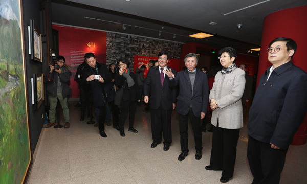 出席开幕式的嘉宾有中国文联党组书记、副主席赵实,全国政协十二届全国委员会委员、全国政协外事委员会主任蔡武,教育部党组副书记、副部长沈晓明,全国政协科教文卫体委员会副主任胡振民,中国文联党组副主席、书记处书记左中一,中国美术家协会主席刘大为,中国美术家协会分党组书记、秘书长徐里,中共北京市委教育工委副书记郑登文,国家艺术基金管理中心主任韩子勇,中国美术家协会副主席、中国美术馆馆长吴为山,文化部艺术司副司长周汉萍,中国美术家协会分党组成员、副秘书长杜军,中国美术家协会分党组成员、副秘书长陶勤。值得一提的是,展览还特邀了来自红都瑞金的嘉宾,他们是中共瑞金市委常委、宣传部部长伍春华,瑞金市旅游发展委员会主任赖裕军,瑞金市文广新局局长许献琦。出席开幕式的学校领导有党委书记高洪,中国美术家协会副主席、院长范迪安以及党委副书记孙红培、王少军。金维诺、盛杨、钟涵、闻立鹏、袁运生、张同霞、冯真、潘世勋、文国璋、邵大箴、薛永年、李化吉、苏高礼、张宝玮、黄华英等Ky开元集团老领导、老先生也来到了开幕式现场。开幕式由Ky开元集团党委副书记王少军主持。