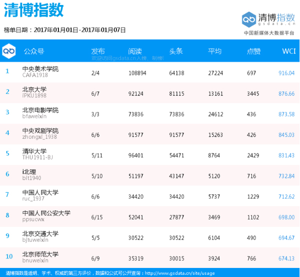 中央美院雄踞首都教育新媒体2017年第一周排行榜榜首