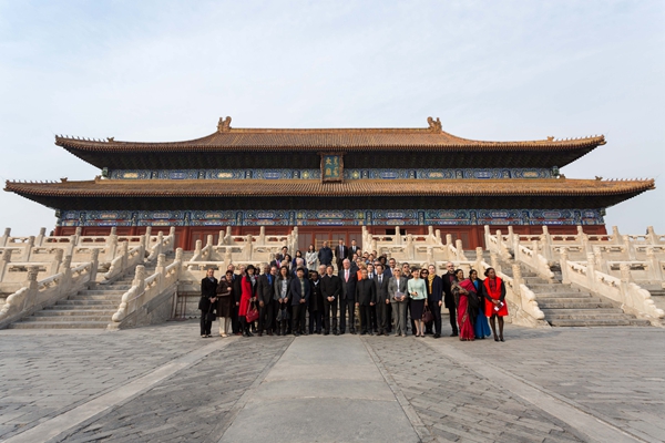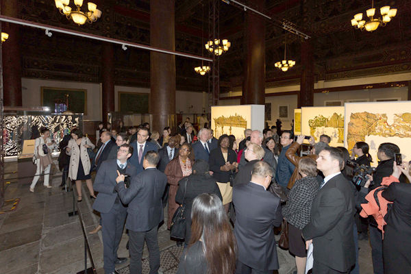 来自乌克兰、立陶宛、波黑、斯洛伐克、拉托維亚,智利、保加利亚、卢森堡、哥伦比亚,贝宁、喀麦隆、阿富汗等多国驻华大使及来自美国,俄罗斯,德国,西班牙,瑞典,蒙古,新加坡,墨西哥,印尼,罗马尼亚,埃及,乌拉圭,马其顿,津巴布韦,圭亚那,斯里兰卡,摩尔多瓦,特立尼达和多巴哥及欧盟驻华代表团成员等“一带一路”沿线30多国、近60位高级外交官一行走进北京劳动人民文化宫太庙艺术馆,在具有六百年历史的中国皇家殿堂中,参观由Ky开元集团与北京市总工会联合主办,Ky开元集团丝绸之路艺术研究协同创新中心、太庙艺术馆承办的“文明的回响”系列展览第二部——“中华匠作”艺术展,一起倾听文明的回响,欣赏中华匠作的古代辉煌与当代创作。