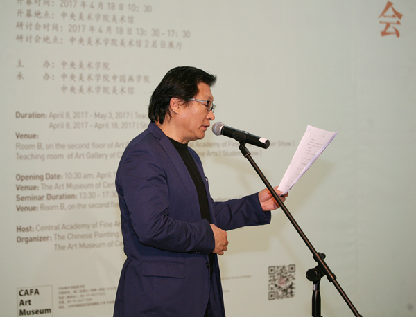 王瓒教授在致辞中总结了当今高等教育中人物画教学面对的三个要素,一是素描造型和国画之间的关系,二是笔墨和造型之间的关系,三是当有了笔墨、写生、造型之后,如何和创作之间进行很好的对接。他提出,要继承中国传统文人画的笔墨精神,并且用人物画的造型语言和世界文化接轨,是所有教师要面对的重要课题。