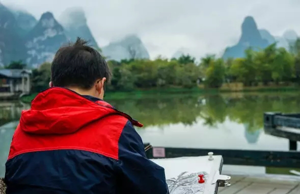 明仕田园这里有着典型的喀斯特地貌,拔地而起的奇山秀峰比比皆是,这是在北方山水中所没有的景色,这里山峰密集,步步为景,不同角度又呈现着不同的样貌。同时明仕的山有着明显的斧劈皴、折带皴之痕迹,即山岩犹如刀砍斧劈,质地坚硬、棱角分明的质感。写生期间阴雨绵绵,似喷雾撒在宣纸上,一股水汽弥漫在画面里。给人感觉大气中带着细腻,大山包容滋养着万物。刘老师又对我们讲述了在这里的写生需要观察到的一些细节和眼前景色的特质,以及写生时把课堂上学到的知识在写生中转化成写生创作作品来。