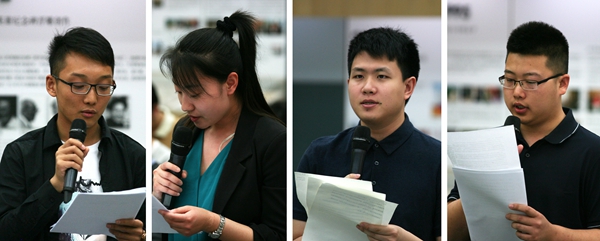 师生代表结合自己的工作生活经历畅谈了体会。造型学院党总支副书记陈晔讲述了自身的择业经历,她希望同学们能够珍惜学校提供的机会,敢于实践,通过“青竹计划”实现理想,成长成才。校学生会主席张琳介绍了学生会的工作情况,说到美院青年人要把学生工作和历史责任相结合。校研究生会主席苏曼提出研究生要时刻谨记肩负时代梦想,用实际行动弘扬五四精神。中国画学院马楚航同学从自己的角度表达了对“青竹计划”的期待。造型学院油画系谢娜同学提及了学习绘画的意义和思考。造型学院壁画系刘畅同学结合自身经历,讲述了学校对美院学生培养的重视。人文学院陈前同学围绕建设文化强国,提出了文化软实力的重要性。