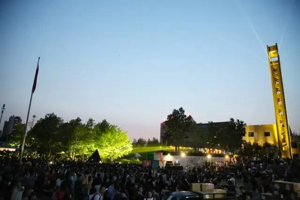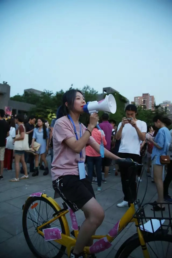 “开展啦!开展啦!来看毕业展啦”晚八点,10位同学手持喇叭、骑着小黄车穿梭在人群中。伴随着暮色,校园里华灯初上,五彩灯束点亮了校园,校史馆、美术馆、5号楼墙外,激光字幕也打出了“开展啦”字样, 2017本科毕业作品展在欢乐的气氛中如约开启。