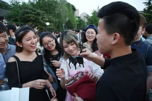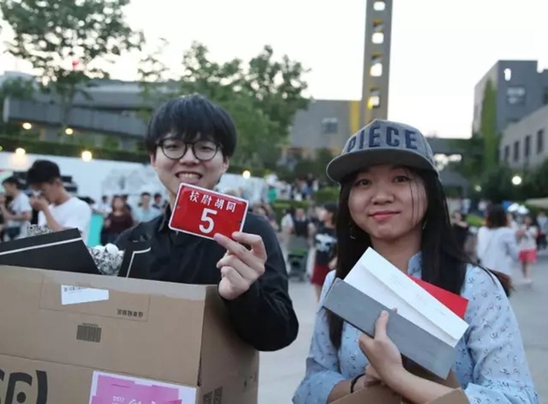 “哇,是孙景波先生签名的速写集”, “我收到的是苏新平老师的擦笔纸,太珍贵啦”,“我的礼物是校尉胡同5号的纪念门牌”,“我拿到了刻有美院名字的灰砖,太棒了,我要镶到我家墙上”,“我收到了马路老师写的字”, “我的是喻红老师送的《人类简史》”,“陈卓老师送的影院VIP卡”, “我的礼物太意外了,是宋协伟老师签名的鲍勃·迪伦黑胶唱片,还有一行字呢:答案在风中飘荡!” “我收到的是范院长写的字,太激动了!”“我太幸运啦,拿到了神秘大奖,要毕业典礼才揭晓呢”……一个个惊喜、意外,也在7号教学楼前、图书馆前、美术馆前、小树林、北区门口、14号楼前等快递现场持续着……