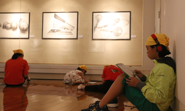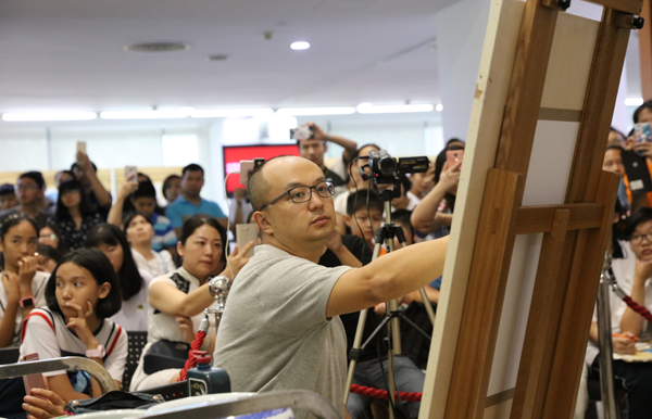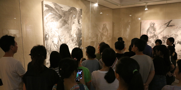 开幕式当天,莞城美术馆还举办了两场公共教育活动。到场的艺术家们为公众进行了详细导览和讲解,中国画学院的廖勤老师做了“名家课堂——线性素描示范”的现场活动,与观众们分享了“线性素描”课程,展示其独到的教学方法,并现场完成男青年肖像写生。展览自9月8日展出以来受到全国很多院校和美术馆的巡展邀请,策展人唐斌老师表示,将会在现有展览结构基础上进一步挖掘优化,选择合适的时间和场馆举办巡展,以期将学院优秀的艺术作品和教育成果带到更多的公众视野中和身边去。