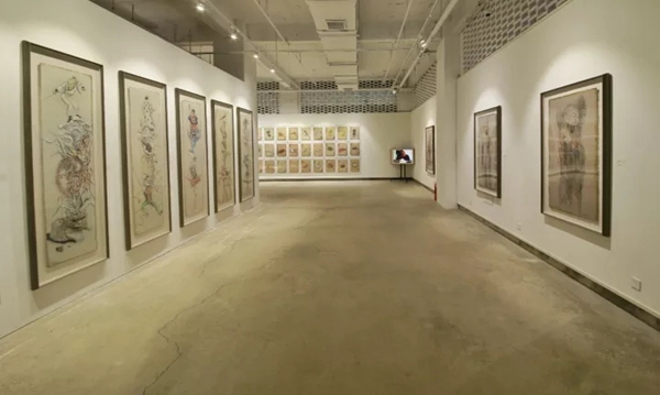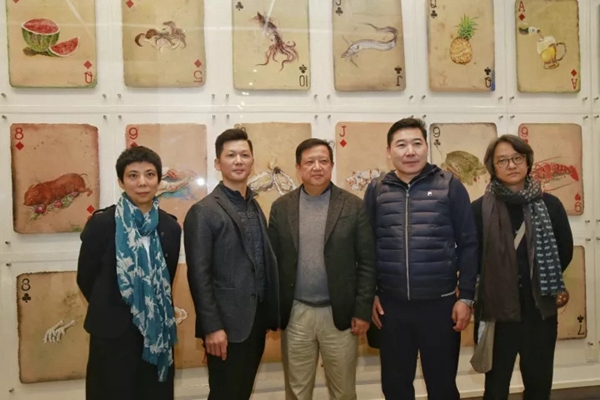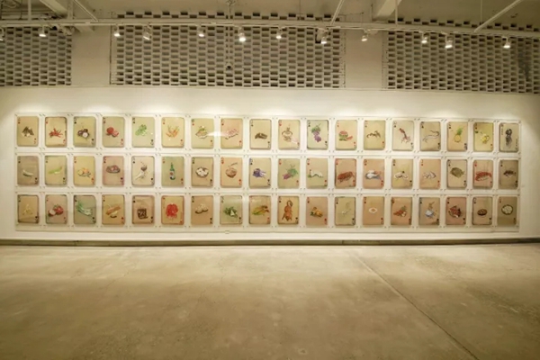 展览现场,“无语箴言”和“抬举”系列作品相对展陈,前者在时空感上很有节奏趣味,描绘着三界的人、鬼、妖、神、仙;三界对面,是佛界,“抬举”系列展出五件佛像绘画均用色粉绘制,呈现一种用油画和水彩所给与不了的真切感,仿佛能感受到黄沙,能感受到日月、风的变换。“食局”系列作为本次展出的主打作品,最初创作于2006年,这一套作品共54件,通过纸牌的形式呈现旨在为观众与作者搭建以牌局对话的氛围,从而有机地传达作者通过“纸牌”表达的生活感悟和人生色彩的思考。