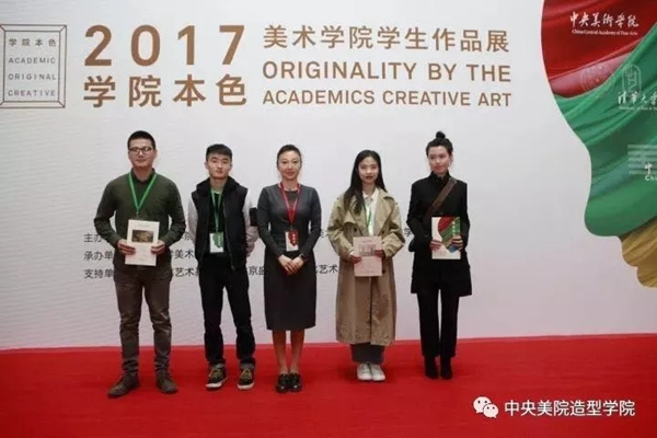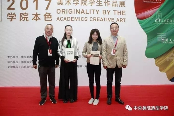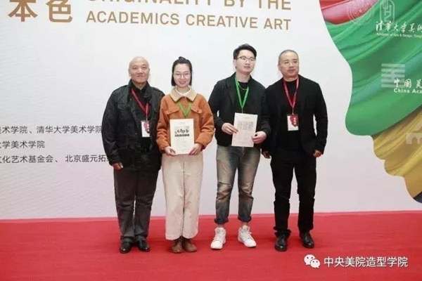 马赛、吴琼、杨冬江及雕塑系书记兼副系主任李鹤为获得“提名奖”的获奖学生代表颁发获奖证书