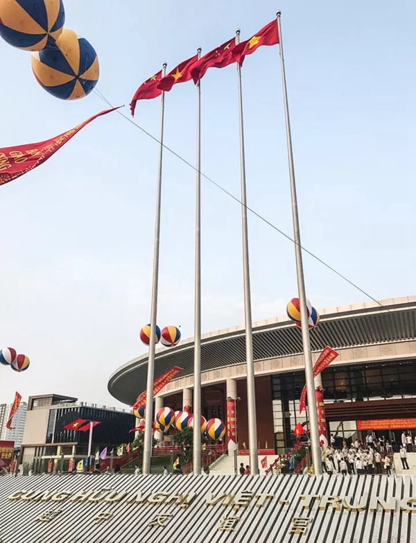 壁画下半部分的浮雕,以自然风貌为背景,两侧分别塑造了生产劳动、丰收歌舞的中越各族人物形象。包括两国共有的民族--壮族、傣族、苗族、彝族等,体现了两国山水相连,民心相通。