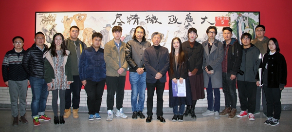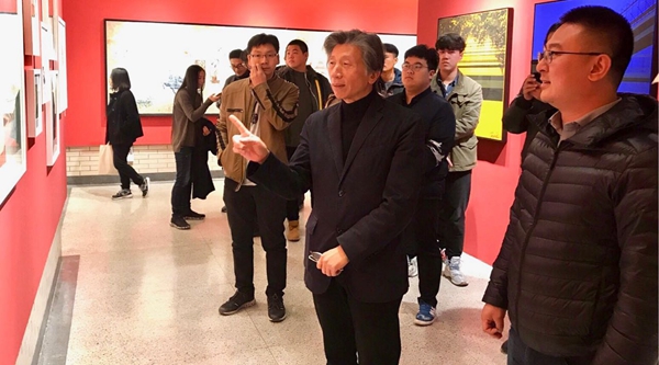 2017年11月7日中午,范迪安院长专程来到5号楼旋转展厅观看了第七届“青春•足迹”学生主题创作展,并亲切勉励获奖学生代表。