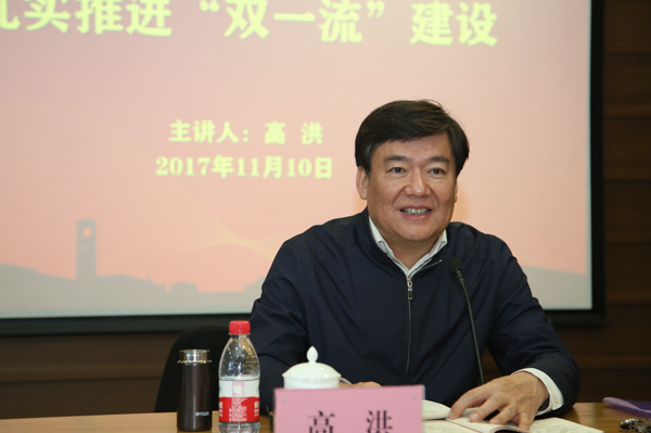 2017年11月10日,行政教辅部门联合党总支分党校2017年秋季培训班邀请党委书记高洪做“学习贯彻十九大精神,扎实推进‘双一流’建设”专题辅导讲座。各行政教辅党支部委员、分党校全体学员,以及部分青年教师一同聆听讲座。