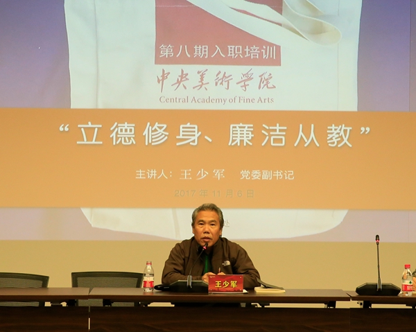 党委副书记王少军为本期培训教职工做了“立德修身、廉洁从教”的讲座,他结合自身美院成长的经历,认为进入美院的每个人,都是一个不可或缺的零部件,对这个部件的一个重要的要求,就是“德”,德性的树立和成长牵扯到零部件的质量,艺术家尤其看重个人的品德履历。
