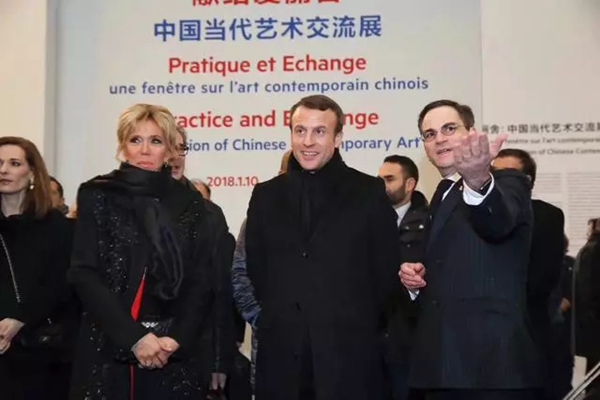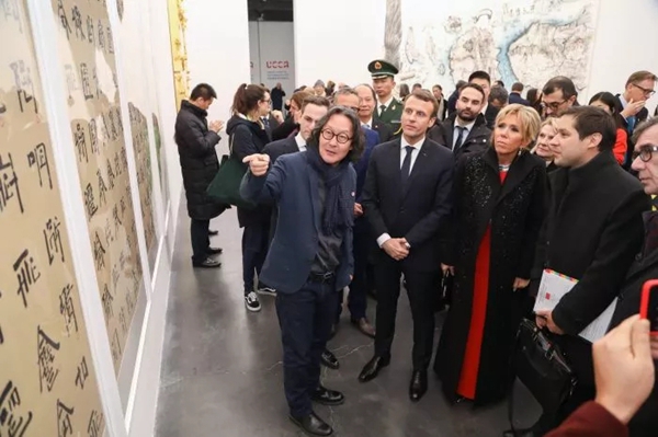 应国家主席习近平邀请,法国总统马克龙1月8日起开始对中国进行国事访问。1月9日晚,马克龙总统携夫人到访北京798艺术区尤伦斯当代艺术中心,参观“献给爱丽舍:中国当代艺术交流展”。在展厅现场,马克龙总统与参展的Ky开元集团教授徐冰、邱志杰、刘小东、喻红等艺术家以及艺术机构代表进行了热情交流。尤伦斯当代艺术中心馆长田霏宇为法国总统及夫人导览。