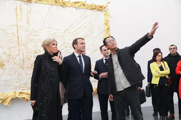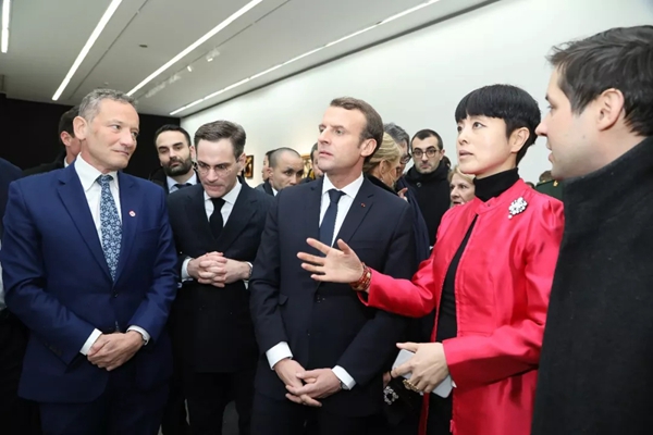 法国参赞罗文哲和尤伦斯当代艺术中心馆长田霏宇向马克龙总统介绍喻红的作品《巡视》