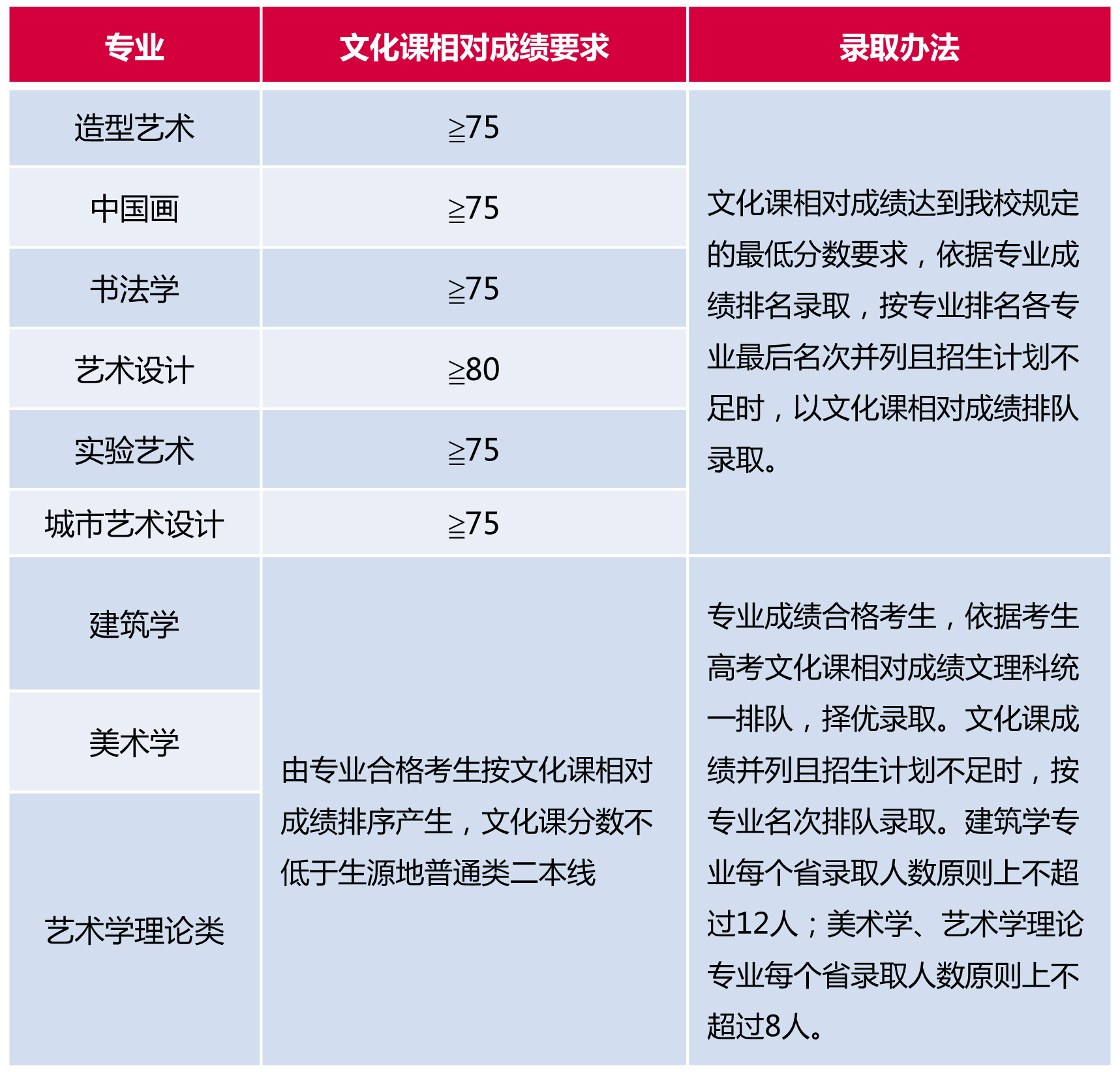 (一)造型艺术、中国画、书法学、实验艺术、城市艺术设计专业考生文化课相对成绩线为75分;