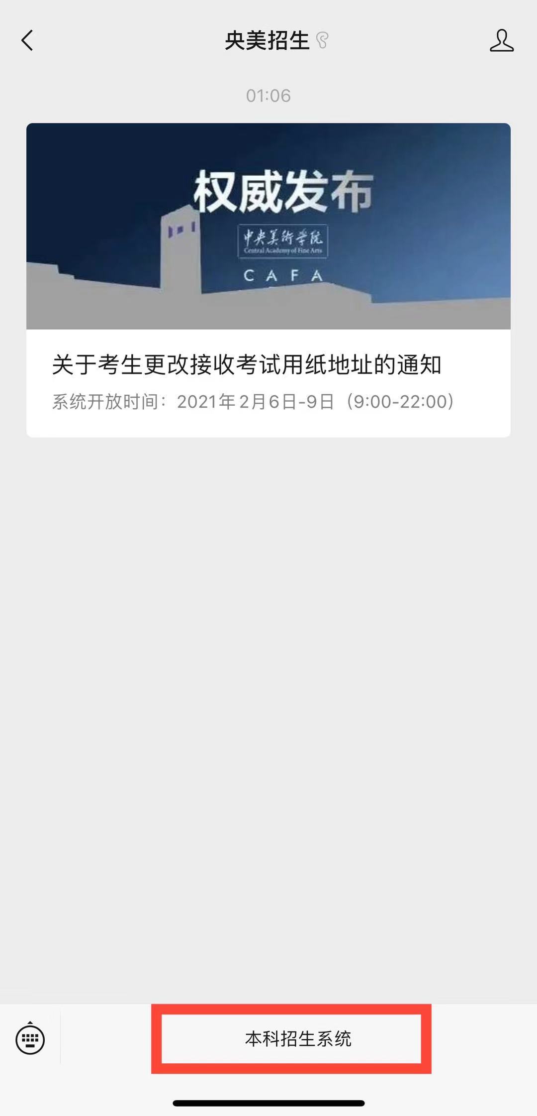 受疫情防控影响,部分考生接收考试用纸地址发生变更。考试用纸接收地址需要更改的考生,务必于2021年2月9日22:00前,通过“央美招生”微信公众号进入本科招生系统,在“我的”-“通讯地址”中更改。本次更改除通讯地址信息外,其他信息不能修改。