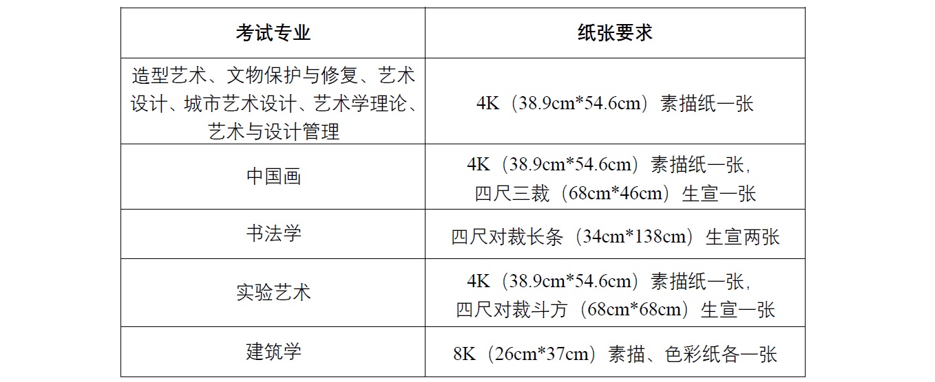 (一)各专业用纸要求:素描纸、色彩纸均为180g,宣纸为净皮白生单宣。除 书法类科目可每科准备两张草稿纸,其他科目禁止携带草稿纸。