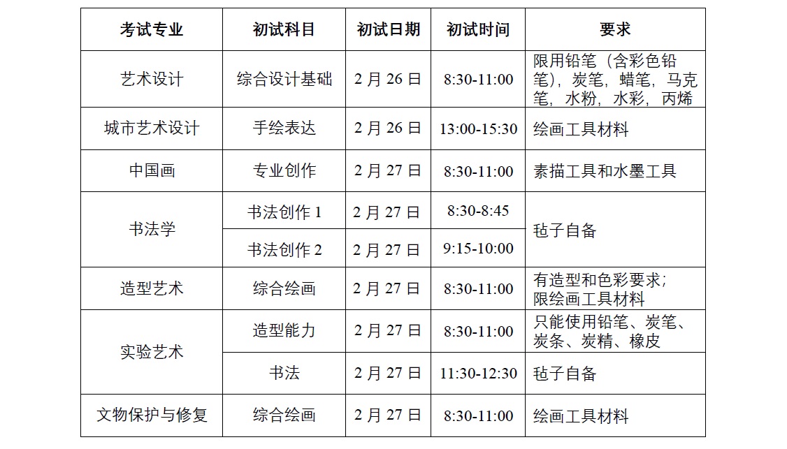 中国画、书法学、造型艺术、实验艺术、艺术设计、城市艺术设计和文物保护与修复专业线上初试科目、时间及要求: