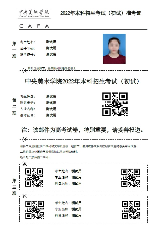1.考生于2月25日-27日通过本科招生系统下载打印准考证。测试用准考证样图见附件,书法学、实验艺术、建筑学、中国画专业第三联为两个信息码,其余专业只有一个信息码;