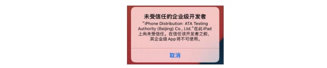 解决方案:打开手机“设置界面”-----选择“通用”----选择“VPN管理与设备管理”-----点击选择“企业级APP”中ATA TestAuthority(Beijing) Co. Ltd.----选择“信任ATA TestAuthority(Beijing) Co. Ltd.”---确定---退出到桌面重新进入软件----正常打开