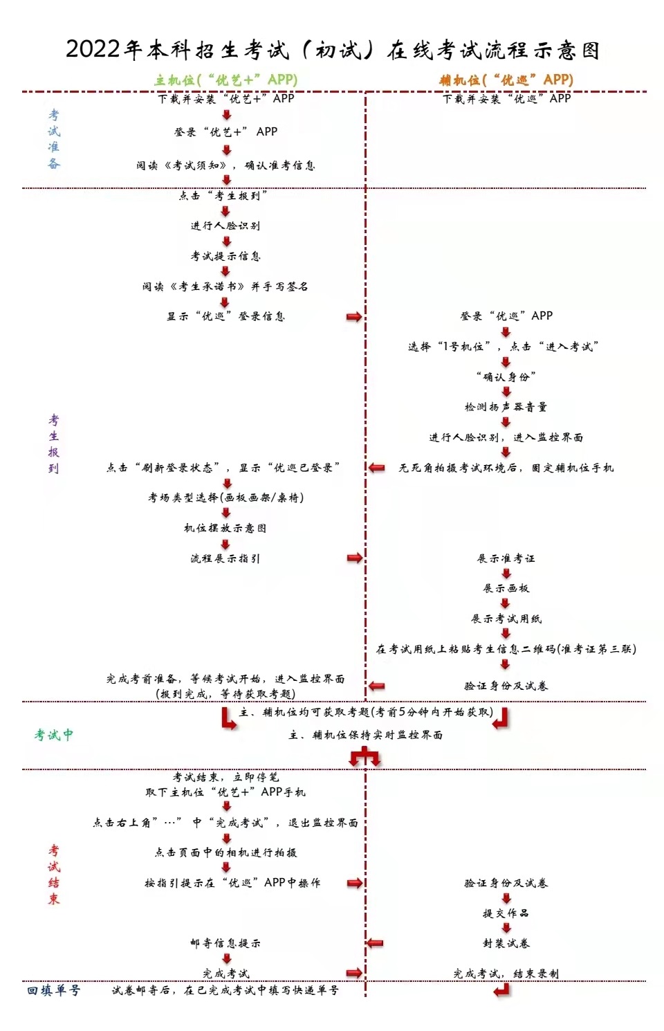 考前30分钟时考生登录主机位手机的“优艺+”APP开始考试准备和考生报到,考试开始后15分钟停止报到,未报到考生无法参加考试。
