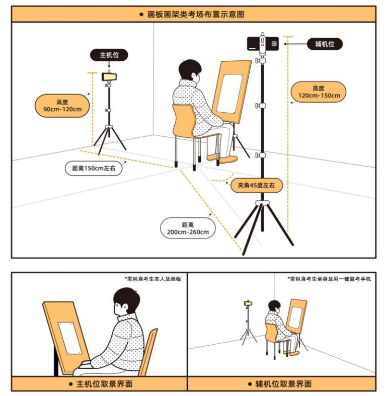 (一)画板画架类考场布置示意图:主机位在考生侧方,辅机位在主机位对侧侧后方。两部手机展示界面如下图所示。