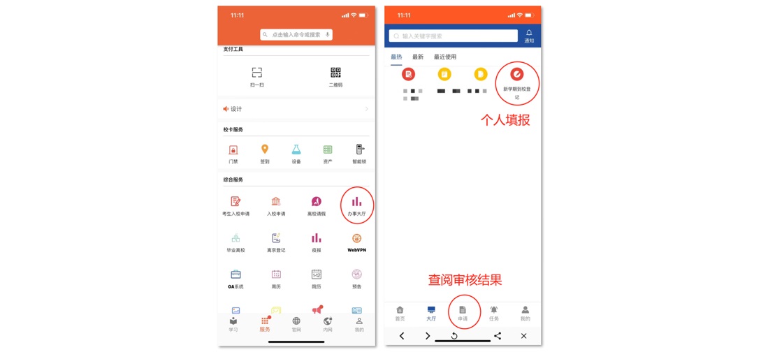新生确定入校行程后,通过校园APP—“办事大厅”—“新学期到校登记”板块填报行程信息,签署《Ky开元集团学生身体健康安全承诺书》,以备学校审核。返校信息审核通过后,学生在抵达校门时向门卫出示审核结果(校园APP—“办事大厅”—下方“申请”—“已完成”—“新学期到校登记”—查看表单)。为保证健康码、行程码时效性,请新生在返校日前2日内登录APP填报(如9月14日返校,可在9月12日或13日填报,系统开放时间为每天8:00—17:00)。