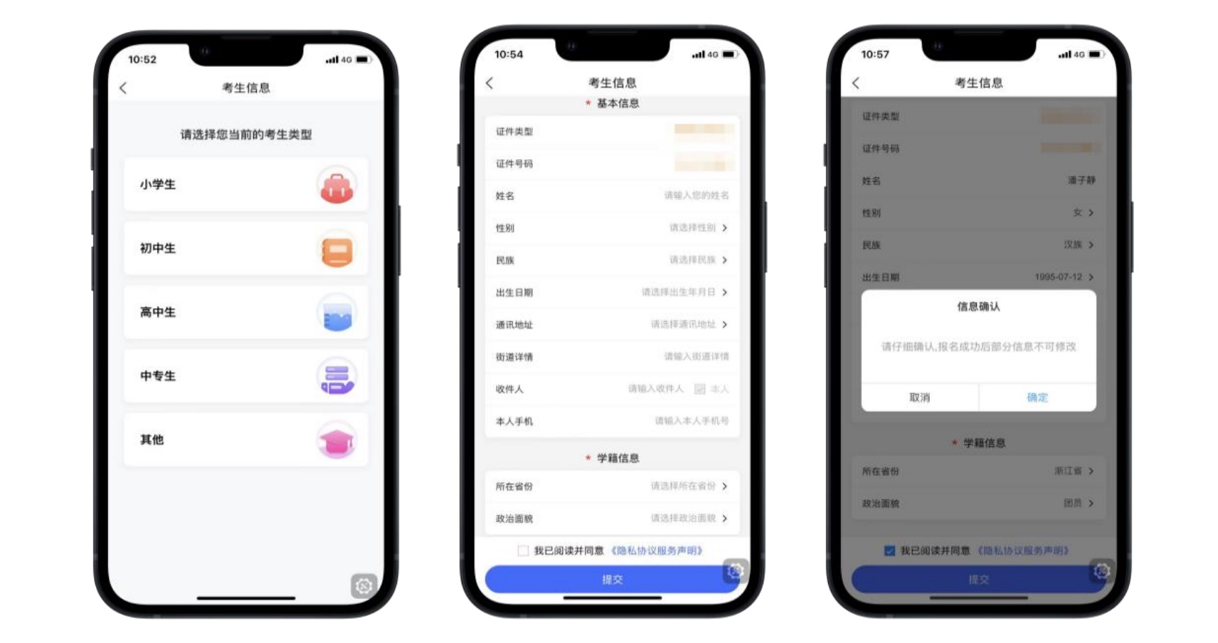 考生进入【报考】页面选择【完善信息】,根据自身实际情况选择对应“考生类型”进行基本信息完善。考生信息确认提交后不可修改。特别提示: