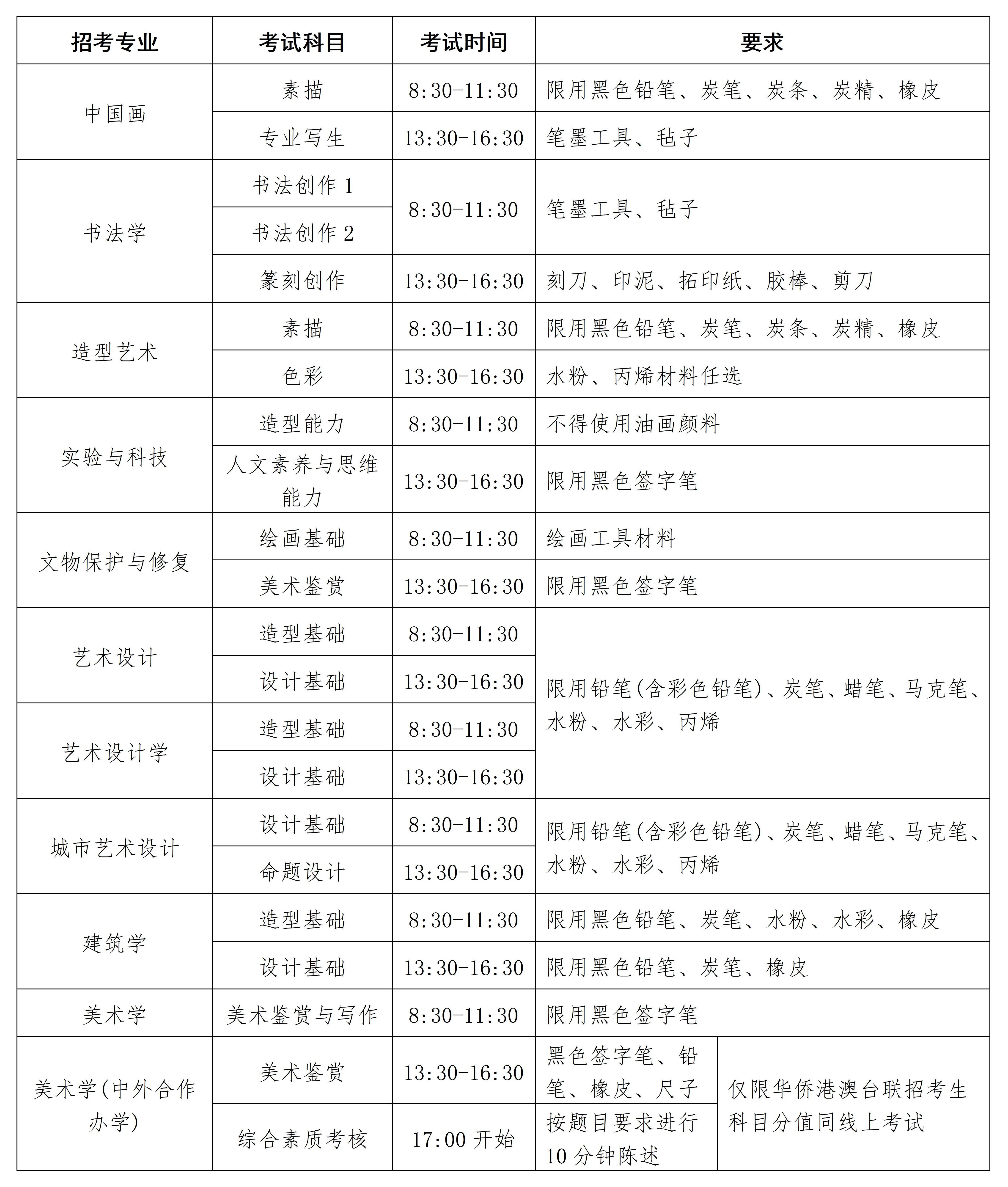 中国画、书法学、造型艺术、实验与科技、文物保护与修复、艺术设计、艺术设计学、城市艺术设计专业考试分为线上考试和现场考试。线上考试评定成绩仅分为合格或不合格。线上考试成绩合格的考生方可参加现场考试。