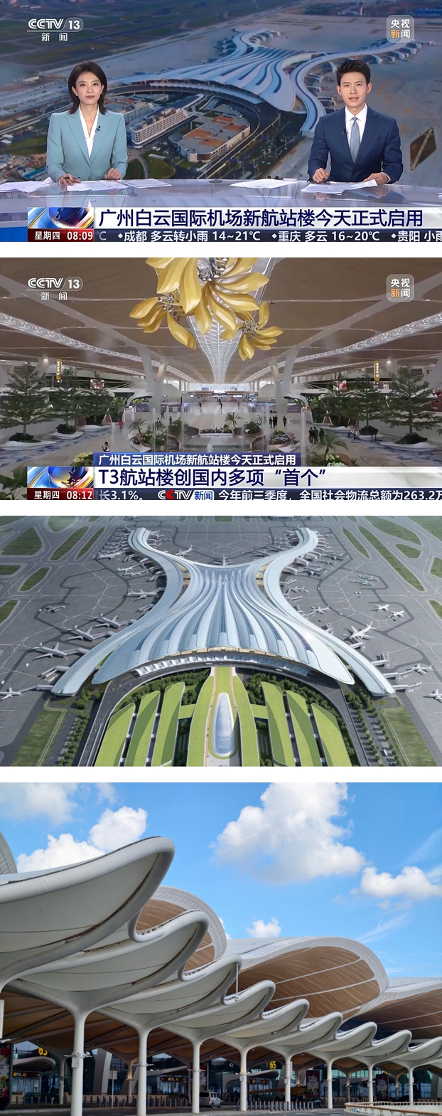 广州白云国际机场T3航站楼以“羊城花冠”为设计意象,融入“云山珠水”“花城” 等城市特色,与综合交通中心实现空铁无缝“零换乘”。随着T3与第五跑道启用,白云机场成为国内首个五跑道航空枢纽,并成为粤港澳大湾区多元文化交融互鉴的重要枢纽,有力推动区域文化协同发展与创新传承。