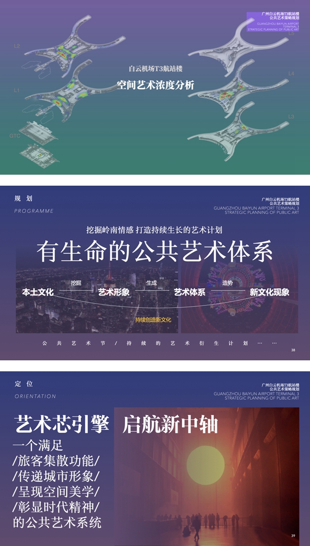 白云机场T3航站楼的公共艺术体系,展现了空间美学理论与实践相结合的探索性实践。通过系统性的规划,艺术介入空间,将航空枢纽转化为承载文化传播功能的复合场域。在创作实践中,项目团队邀请国际顶尖艺术家参与,运用现代艺术语言解构岭南传统文化符号,实现传统艺术元素的创造性转化与创新性发展;同时整合数字交互、虚拟现实等前沿技术,构建动态化、沉浸式的文化感知场景,使传统文化资源获得新的诠释载体与传播路径。