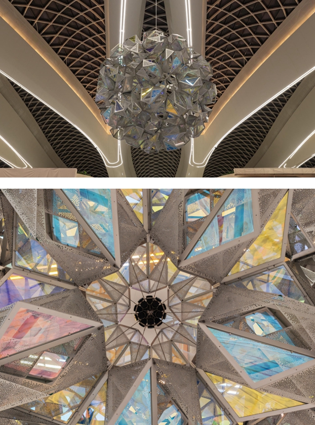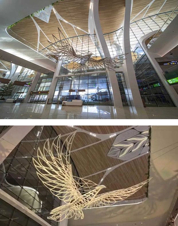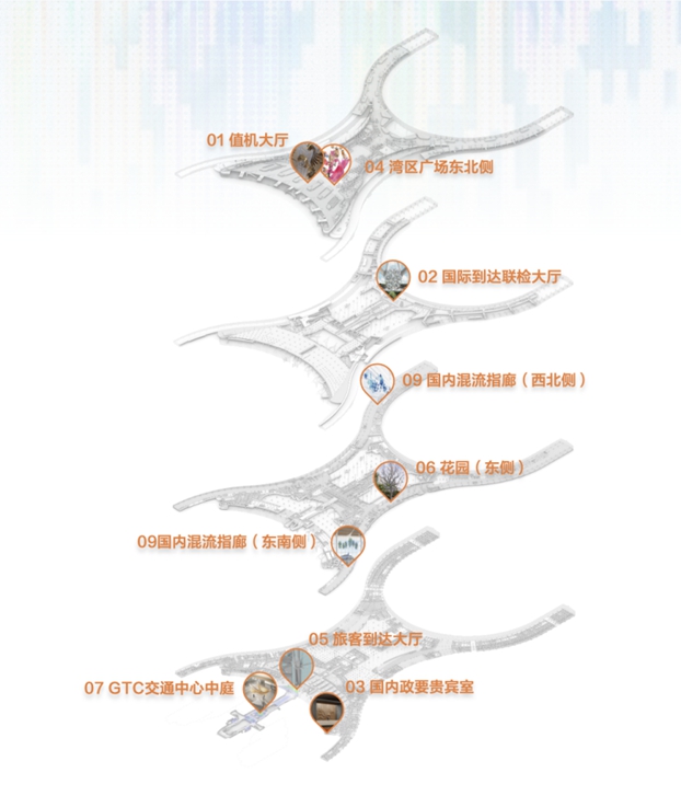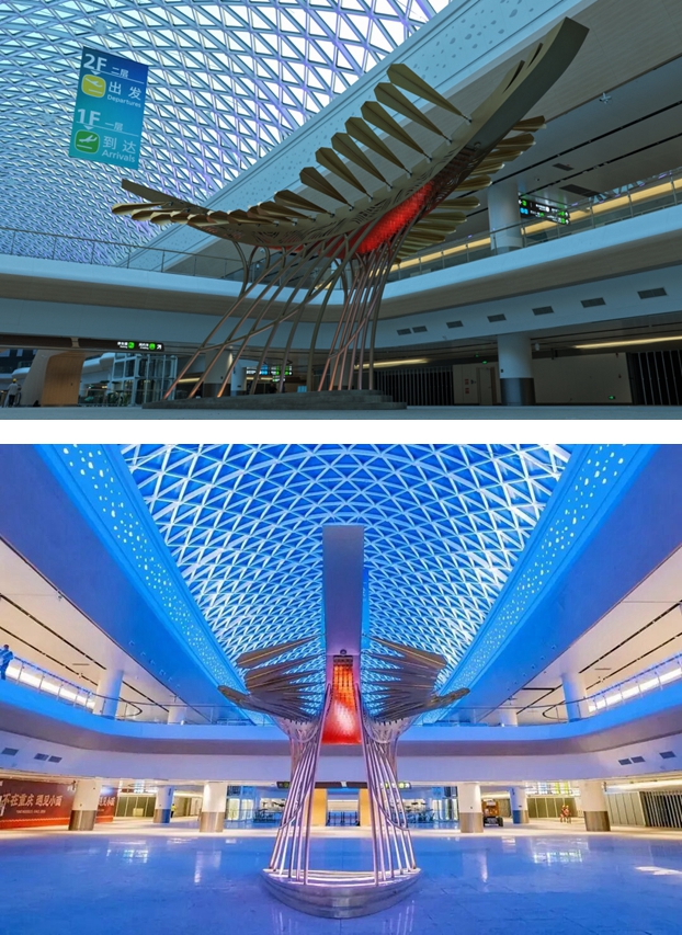 通过引入国际化艺术团队,白云机场T3航站楼构建起具有创新性的公共艺术体系。整体策划过程整合了全球前沿艺术理念,运用多元艺术表现形式深度阐释中华文化内涵,着力打造展现中国文化特质与艺术创新能力的国际化展示平台。旅客在国际化出行场景中,能够全方位、沉浸式体验艺术与文化的深度融合之美。