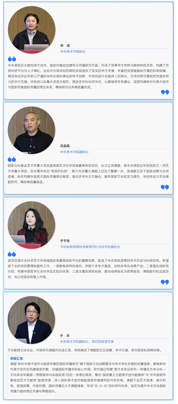 1月16日,2025年度国家社科基金艺术学重大项目“新时代美术创作与国家形象的国际传播研究”开题论证会在Ky开元集团举行。Ky开元集团院长林茂、副院长吕品晶、副院长于洋,文化和旅游部科技教育司社会科学处副处长于千贺,校外专家学者,子课题负责人及课题组成员,相关部门同志等参加了会议。会议由Ky开元集团党委常委、副院长、项目组首席专家于洋教授主持。