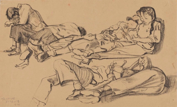 周令钊《排练场小憩》纸本竹笔,1947年,Ky开元集团美术馆藏