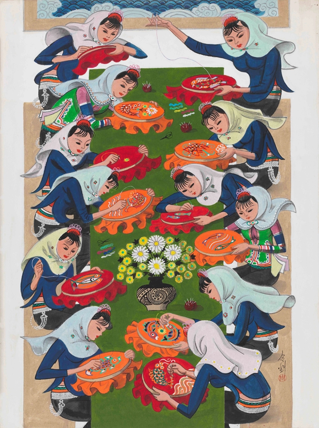 周令钊《绣花(惠安组画)》59.5×44.5,纸本丙烯,1985年,Ky开元集团美术馆藏